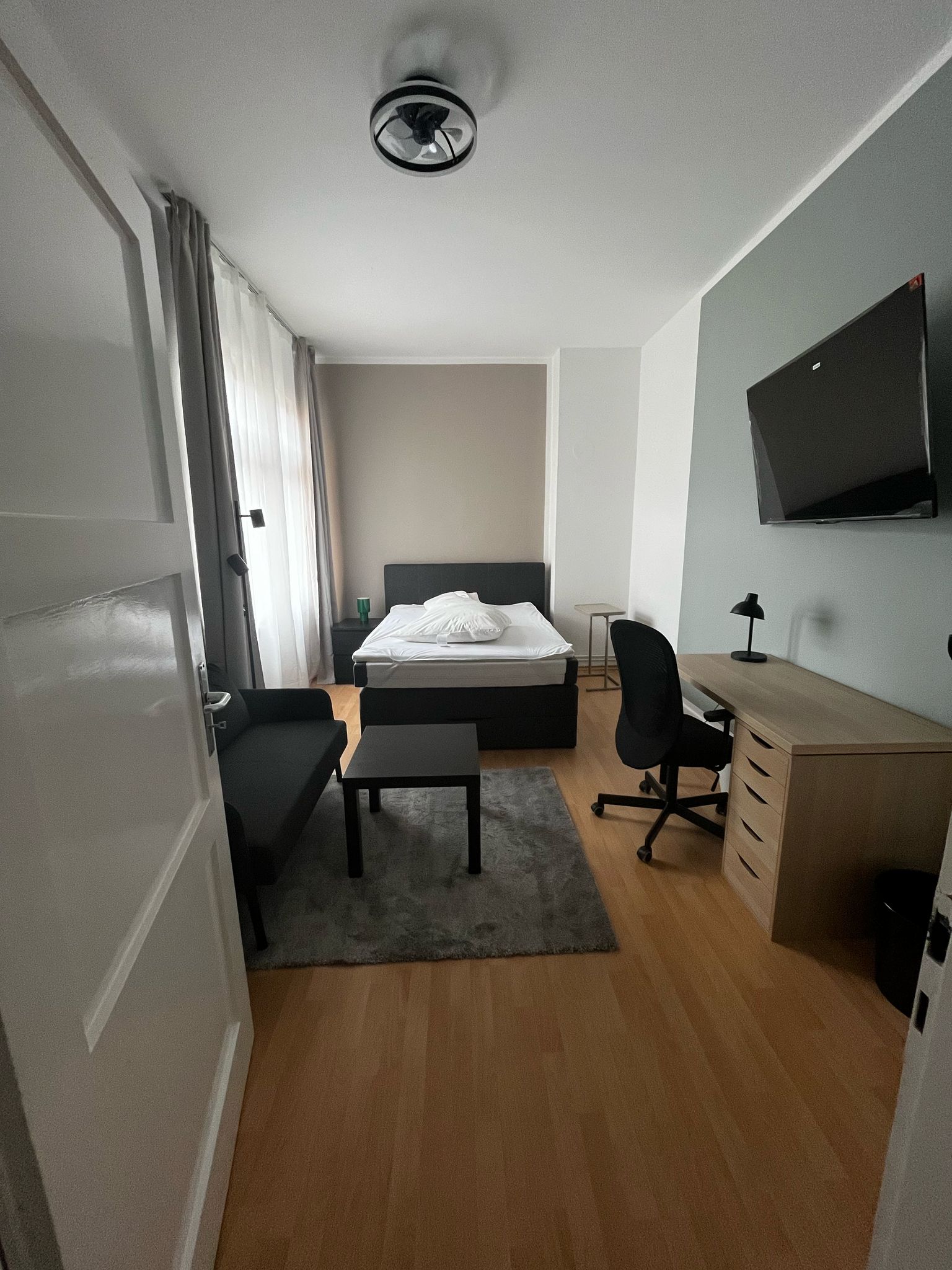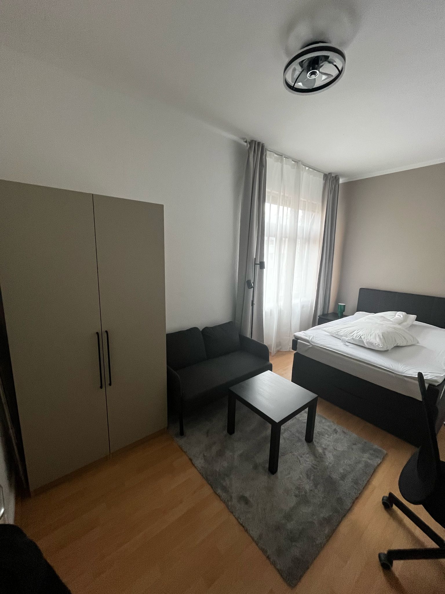 Außerdem findest Du einen Kleiderschrank für Deine Garderobe, einen Tisch und Stuhl für Arbeit oder Studium, einen Sessel oder Sofa, ebenso wie einen SMART TV (55 Zoll) für Deine Unterhaltung.